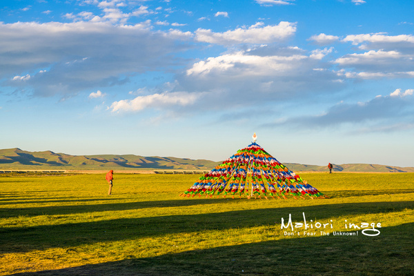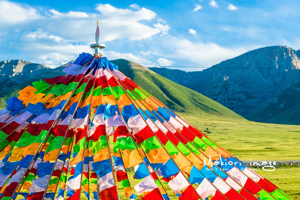 經(jīng)幡隨風(fēng)飄動(dòng),每飄動(dòng)一次,吉祥祝福的意愿就飄向遠(yuǎn)方。我坐在不遠(yuǎn)處的草坪上,帶著虔誠凝視了許久。