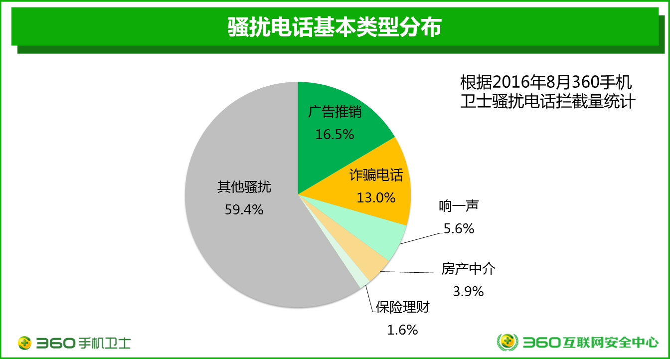 僅2016年8月,360手機(jī)衛(wèi)士就為全國用戶攔截各類騷擾電話34.3億次,平均每天攔截騷擾電話約1.11億次。其中,共攔截詐騙電話4.45億次,占到了當(dāng)月騷擾電話攔截總量的13.0%,平均每天攔截詐騙電話約1435萬次。考慮到詐騙電話可能給用戶帶來的經(jīng)濟(jì)損失和其他嚴(yán)重后果,詐騙電話顯然已經(jīng)成為危害最為嚴(yán)重的騷擾電話類型。
