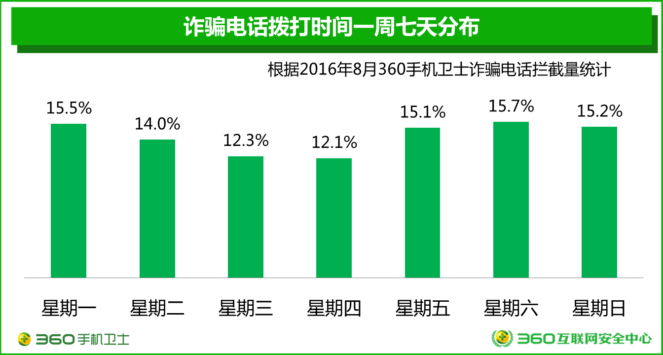 根據(jù)2016年8月360手機(jī)衛(wèi)士攔截詐騙電話情況的抽樣分析顯示:每周五到下一周的周一,每天詐騙電話呼叫量均超過了一周總量的15%,而周二到周四的呼叫量則相對較低。報(bào)告認(rèn)為造成這種情況的主要原因在于,周末很多人都會(huì)獨(dú)自在家,有空閑時(shí)間,而且身邊沒有可以給自己提醒的人,被騙子成功詐騙的幾率也就更高。騙子們也因此選擇在周末來撥打更多的詐騙電話。