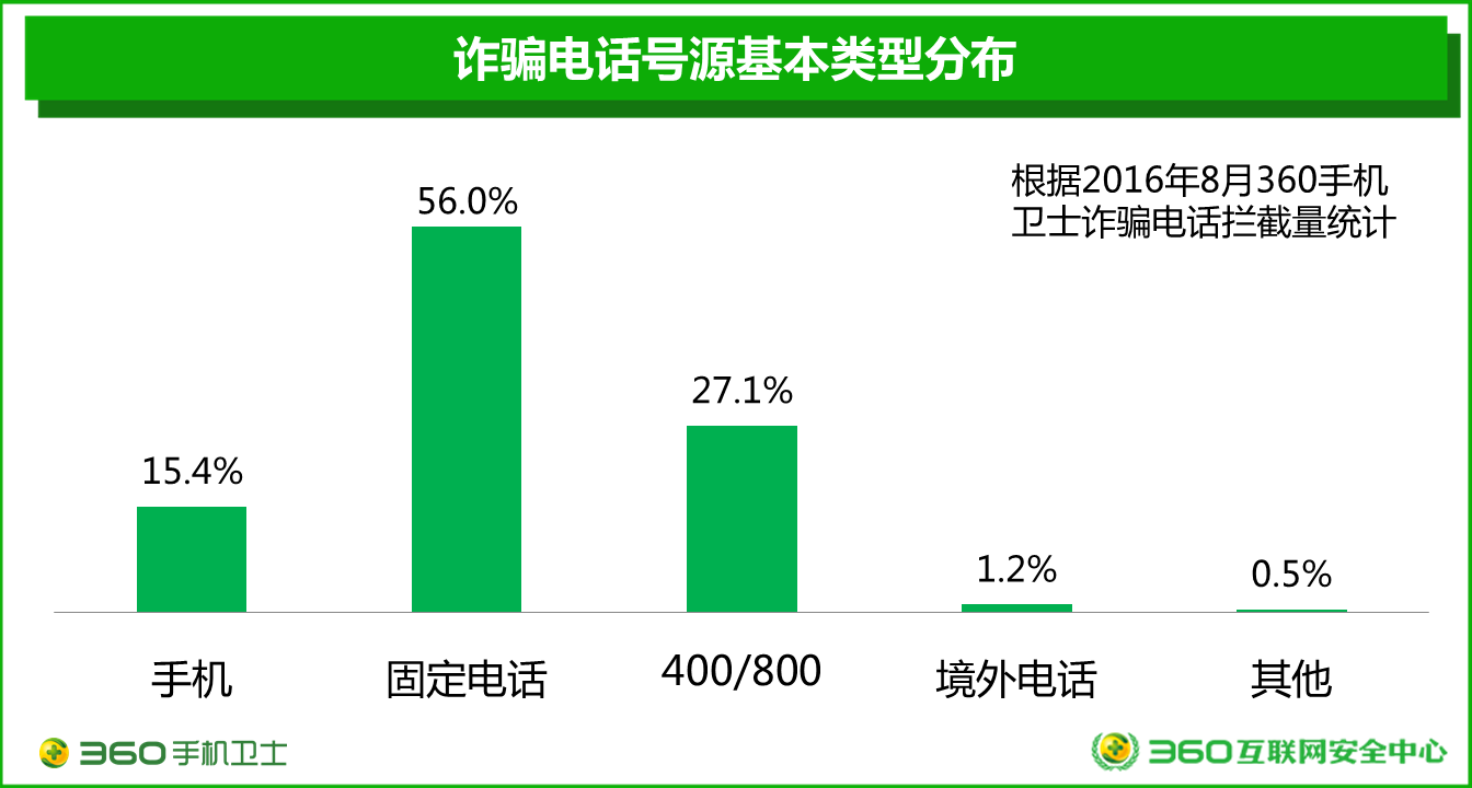 根據(jù)2016年8月360手機(jī)衛(wèi)士攔截詐騙電話情況的抽樣分析顯示:在詐騙電話的號碼源中,固定電話呼出的詐騙電話數(shù)量最多,占所有詐騙電話呼叫量的56.0%;其次是400/800電話,占比為27.1%;手機(jī)呼出的詐騙電話占詐騙電話呼叫總量的15.4%;此外,還有1.2%的詐騙電話來自境外呼入?梢,固定電話和400/800號碼更應(yīng)該成為詐騙電話治理的重點(diǎn)對象。