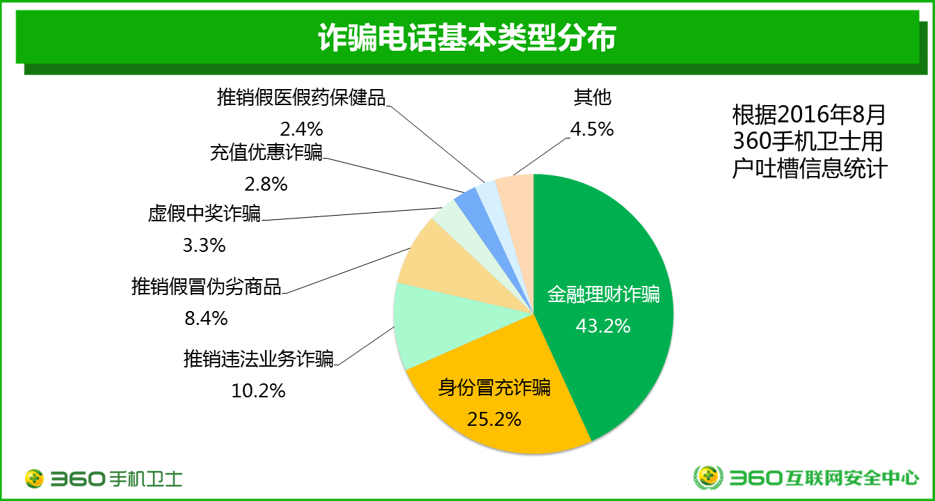 根據(jù)2016年8月360手機(jī)衛(wèi)士用戶的“吐槽信息”的統(tǒng)計(jì)分析顯示,在用戶接到所有的詐騙電話中,虛假的金融理財(cái)詐騙最多,占43.2%,此類詐騙在北上廣深等大城市尤其盛行;其次是身份冒充詐騙,占25.2%。兩類詐騙相加占比68.4%。在身份冒充類詐騙中,冒充電信運(yùn)營商的詐騙數(shù)量最多,占比為26.0%;其次是冒充領(lǐng)導(dǎo),占21.2%;排名第三的是冒充快遞,占14.3%。