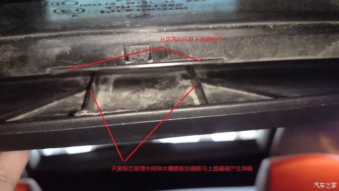 相信很多車友都知道,4S店一般都是“和稀泥”不愿意解決這種問題。實際就是前后玻璃導(dǎo)水槽與下面蓋板中間的兩條小加強筋磕碰產(chǎn)生的響聲。