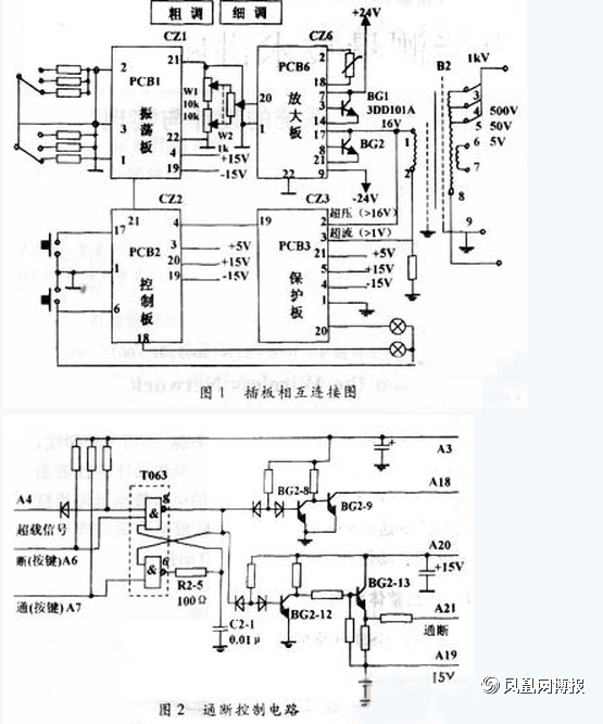 BG6—6、BG6—7、BG6—5、BG6—1、BG6—2,電位器W6—1、W6—2等元件。放大板經(jīng)檢修后插入機(jī)中,開啟電源,慢慢調(diào)節(jié)輸出至最大,用萬(wàn)用表交流電壓檔測(cè)輸出變壓器B2初級(jí)端電壓應(yīng)為16V。如電壓正常則排除輸出變壓器的故障。繼續(xù)用萬(wàn)用表直流電壓檔測(cè)量通斷控制板PCB2的端子21對(duì)地電壓,開關(guān)通時(shí)應(yīng)為+2V,開關(guān)斷時(shí)為-5V。端子18對(duì)地電壓應(yīng)為+0.2~0.7V(指示燈亮?xí)r)或+12V(指示燈滅)。如不正常,可判斷故障源在通斷控制板;如電壓正常,故障可能在振蕩板PCB1。測(cè)PCB1的端子21、22之間的電壓應(yīng)為1.6V,如無電壓,推斷故障原因是振蕩板停振,因而不具備正常的工作條件。繼續(xù)查找振蕩板上的元件,檢查的重點(diǎn)放在振蕩板上的運(yùn)放BG1—3,壞的可能性極大。如振蕩板起振正常,接著查放大板PCB6的端子20、22之間電壓應(yīng)為1.6V,若遠(yuǎn)小于此參考值或沒有電壓,可以據(jù)此判斷振蕩板PCB1與放大板PCB6的連線開路或短路。查出故障點(diǎn)后進(jìn)行線路處理或更換元器件。